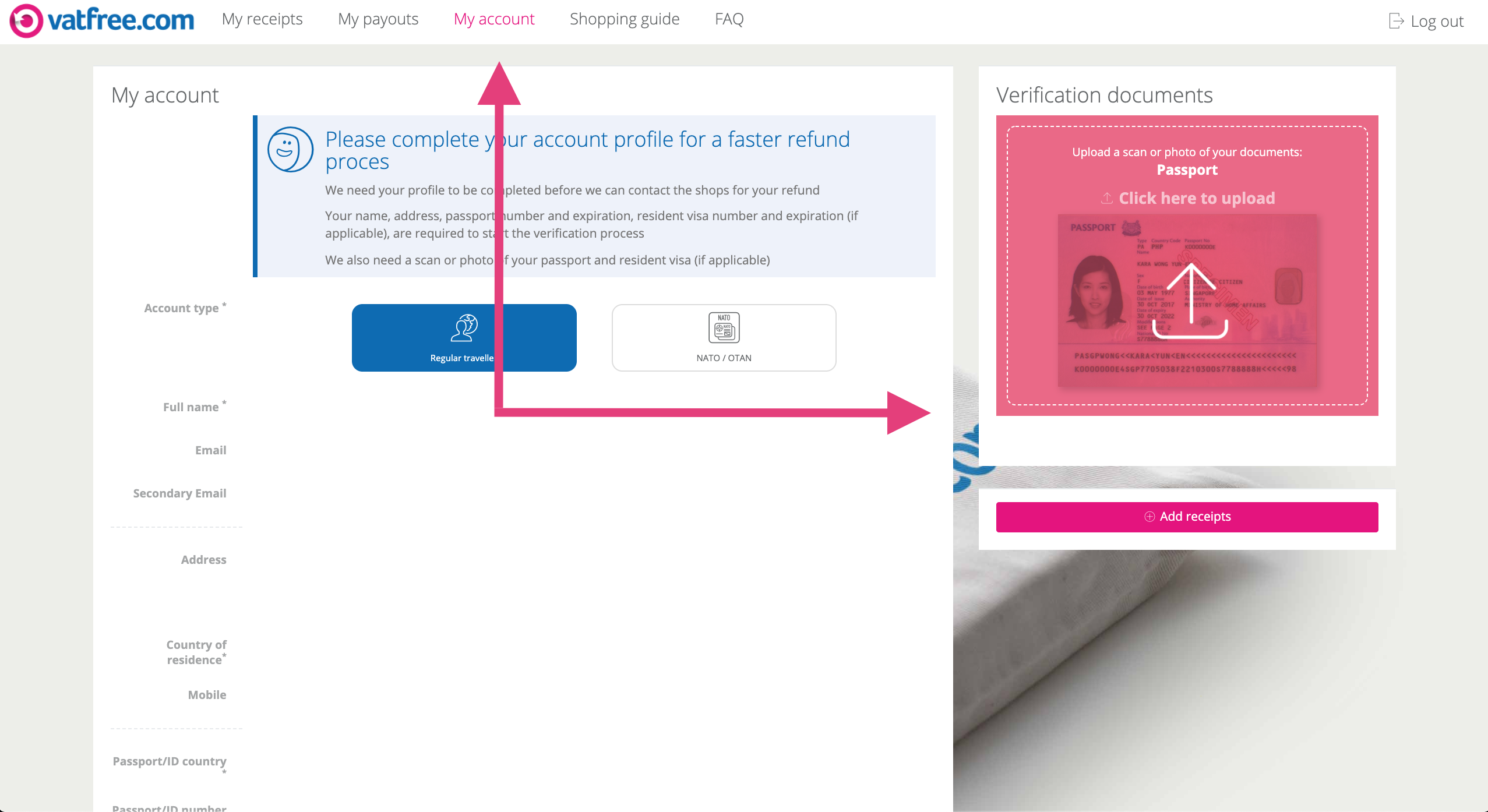 Wanneer u bent ingelogd via de website en op uw account pagina bent, kunt u een kopie van uw paspoort uploaden aan de rechterkant van de pagina: